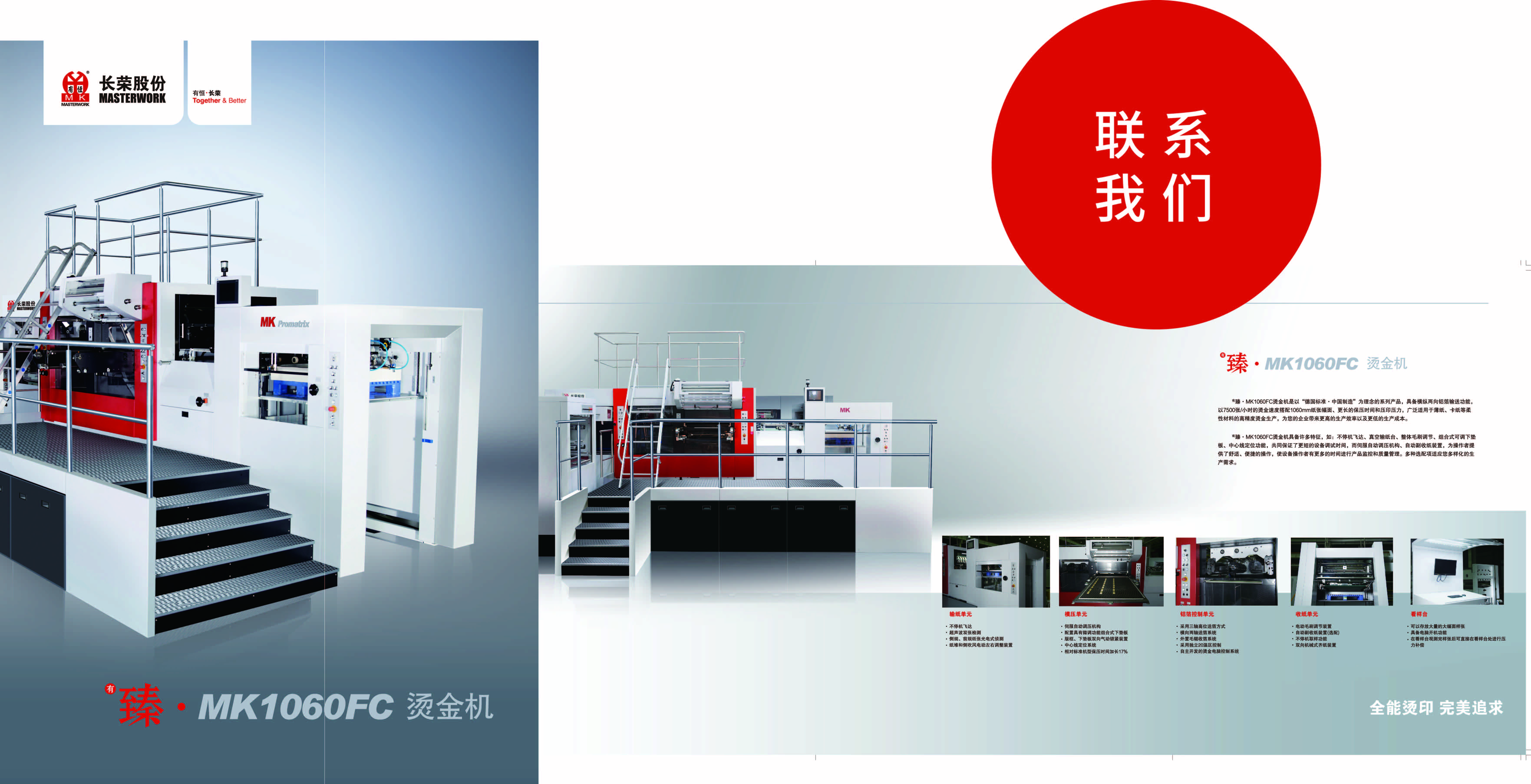 有臻?MK1060FC 燙金機是以“德國標準?中國制造”為理念的系列產品具備橫縱兩向鋁箔輸送功能,以7500張/小時的燙金速度搭配1060mm紙張幅面、更長的保壓時間和壓印壓力,廣泛適用于薄紙、卡紙等柔性材料的高精度燙金生產,為您的企業帶來更高的生產效率以及更低的生產成本。